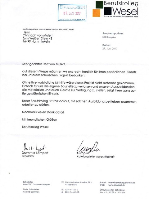 + "Hallo Familie von Mulert, ich möchte mich hiermit ganz herzlich für die einwandfreie und korrekte Ausführung unseres Auftrages bedanken. Großes Lob an Ihr kompetentes Team. Wir sind mehr als zufrieden und werden Sie gerne empfehlen. Herzliche Grüße, Familie K."